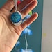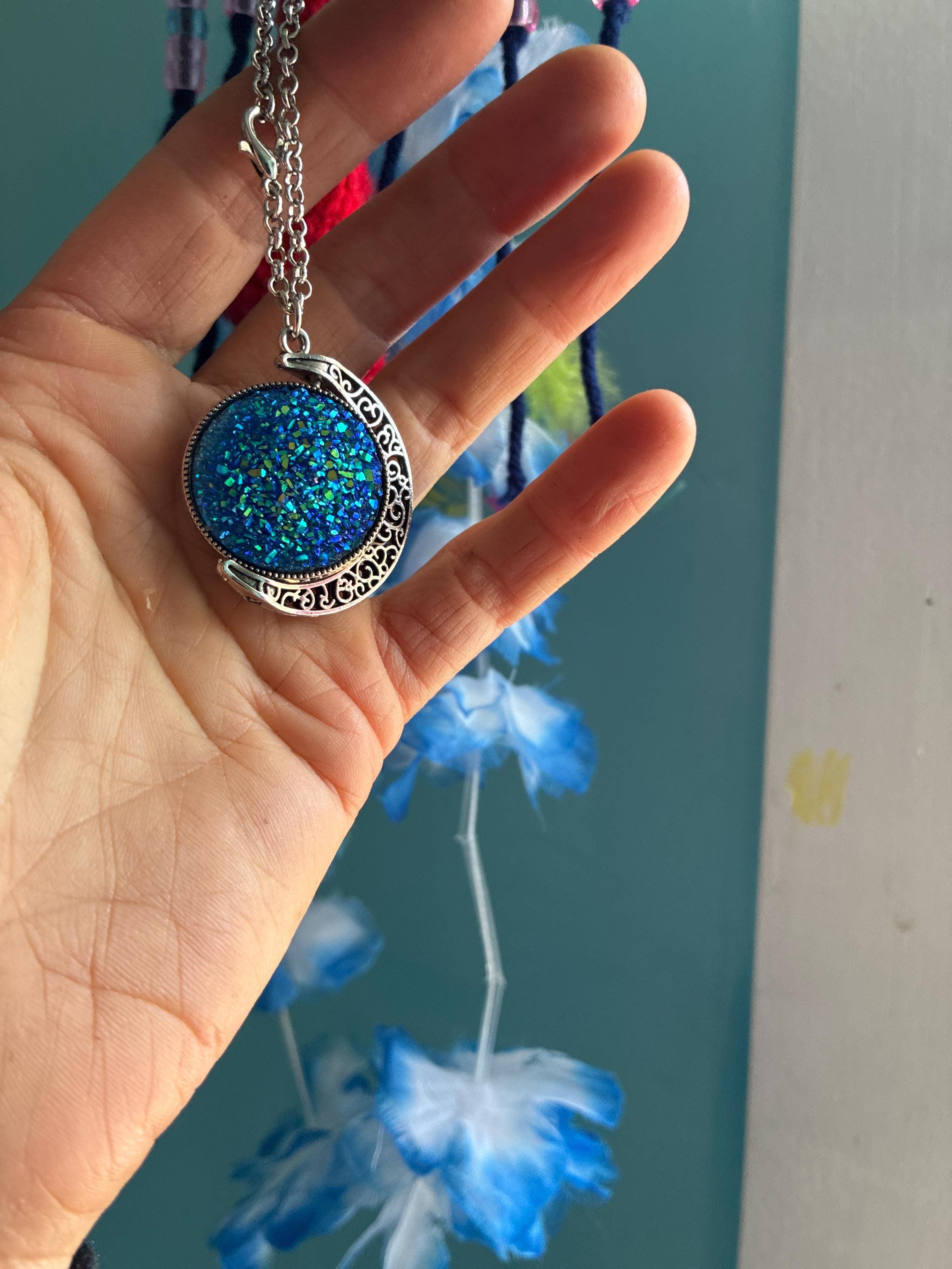 This necklace features a large silver-tone metal spinner pendant. The outer moon-shaped half-ring of the pendant holds still, and the inner section spins. One side of the inner section has a rough faux druzy iridescent blue acrylic cabochon, the other side has a glass cabochon over iridescent light blue glitter resin. The pendant hangs from a 24'' silver tone rolo chain. The outer pendant size is approx 1.5" tall including the loop, the inner spinning section is approx 1" tall.