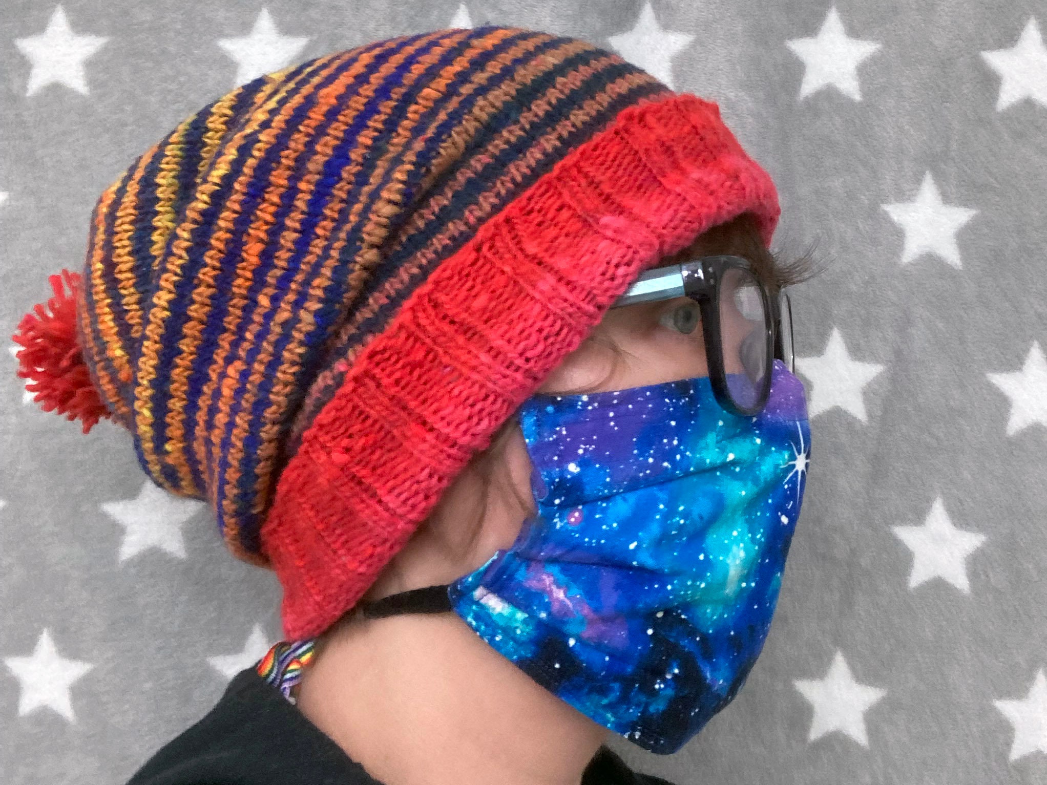 This is a warm, cozy hand-knit hat, made from Noro Kureopatora yarn. Noro is my absolute favorite yarn brand, with amazing gorgeous color combinations. This hat stripes together two colorways of the same yarn, one a gradient of vivid reds, pinks, oranges, yellows, and browns, and the other in deep blues and black. The yarn is 100% wool. The hat has a red pom-pom on top, made from the same yarn.